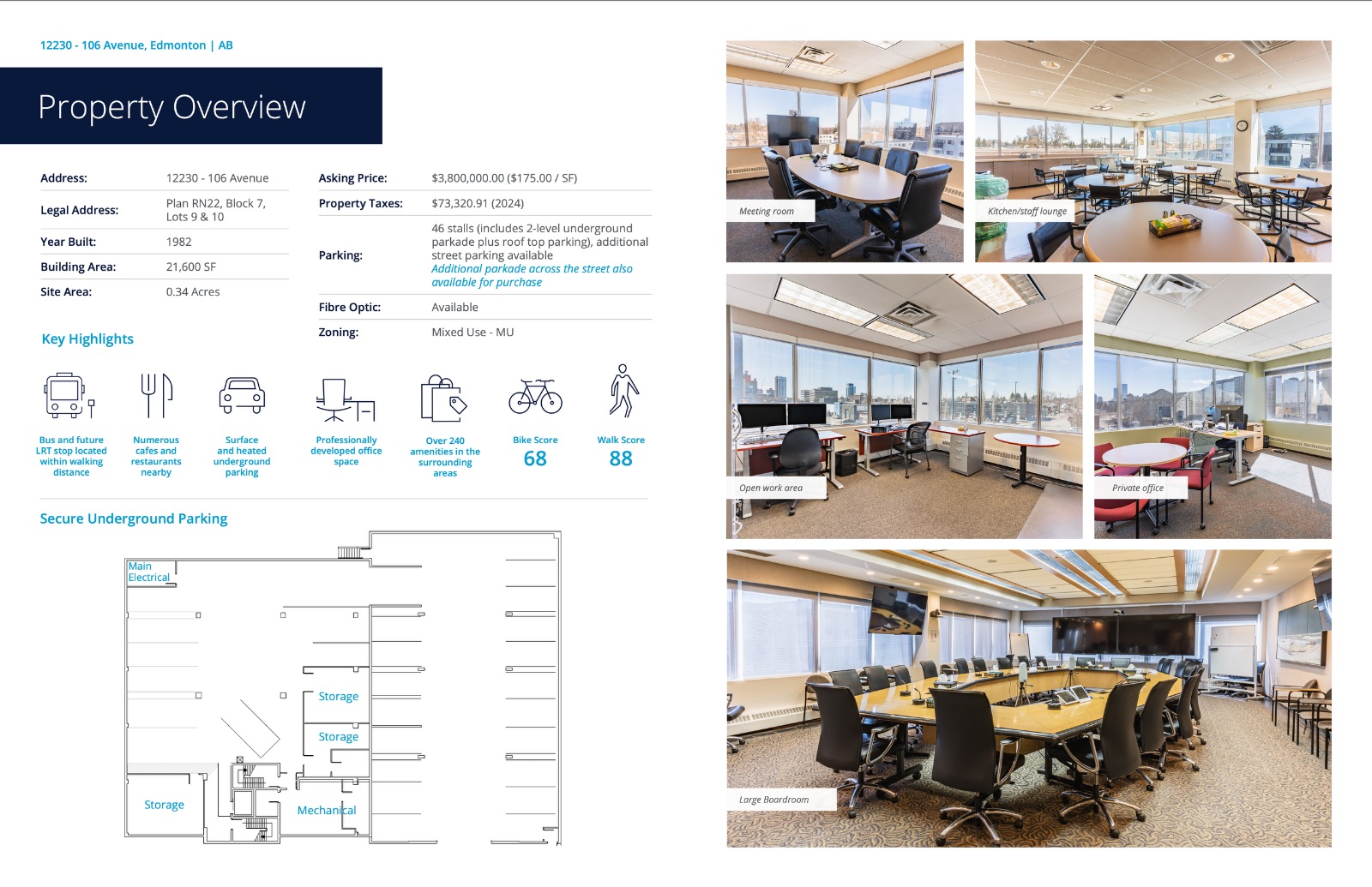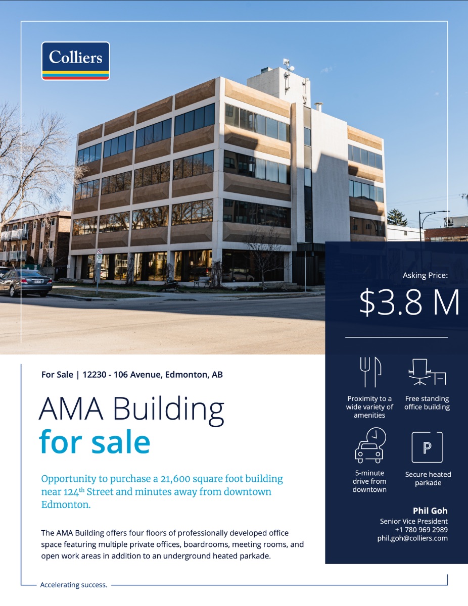Opportunity to purchase a 21,600 square foot building near 124th Street and minutes away from downtown Edmonton. The AMA Building offers four floors of professional developed office space featuring multiple private offices, boardrooms, meeting rooms, and open work areas in addition to an underground heated parkade. The AMA Building is situated in the heart of the 124th Street district, just steps away from the iconic 124th Street, renowned for its eclectic mix of boutique shops, art galleries, restaurants, and more. Everything you need is within walking distance. Just one block away is Manches...