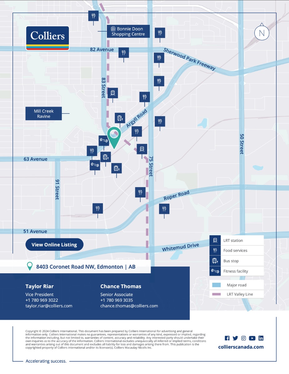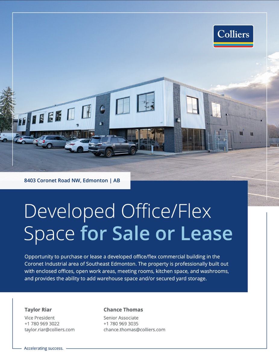 Opportunity to purchase or lease a developed office/flex commercial building in the Coronet Industrial area of Southeast Edmonton. The property is professionally built out with enclosed offices, open work areas, meeting rooms, kitchen space, and washrooms, and provides the ability to add warehouse space and/or secured yard storage.