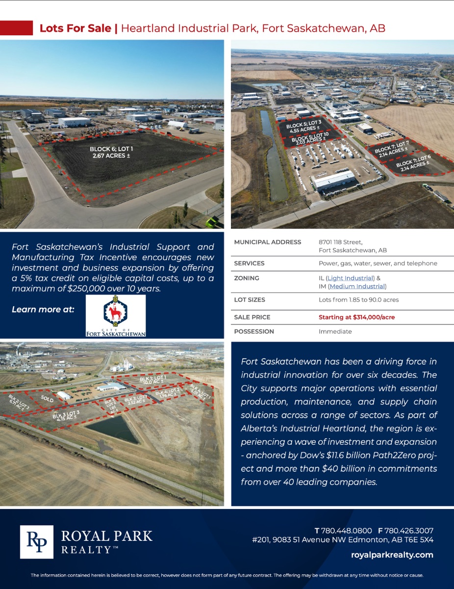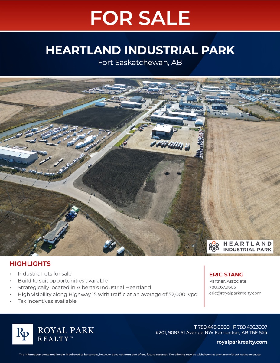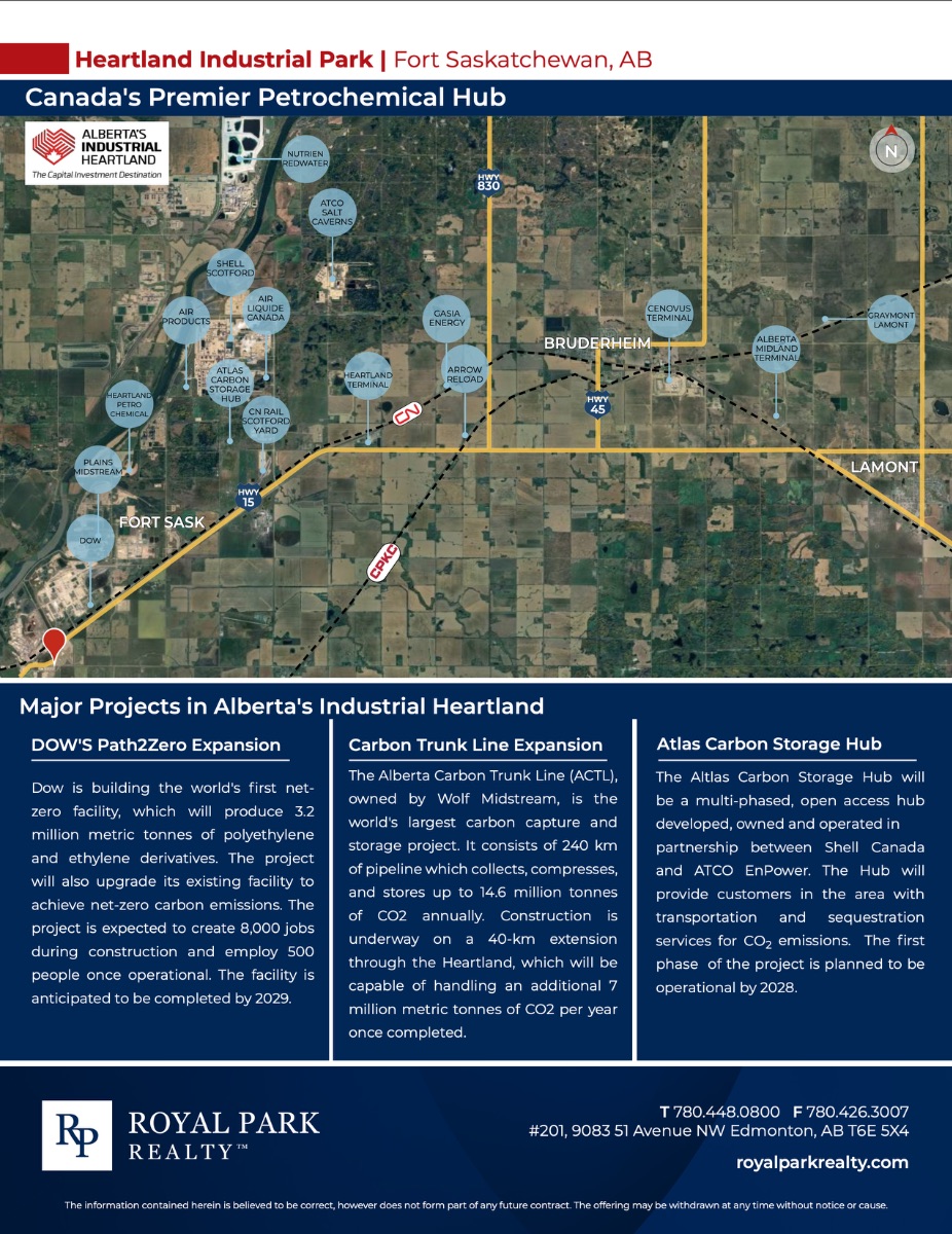 Industrial lots for sale Build to suit opportunities available Strategically located in Alberta’s Industrial Heartland High visibility along Highway 15 with traffic at an average of 52,000 vpd Tax incentives available