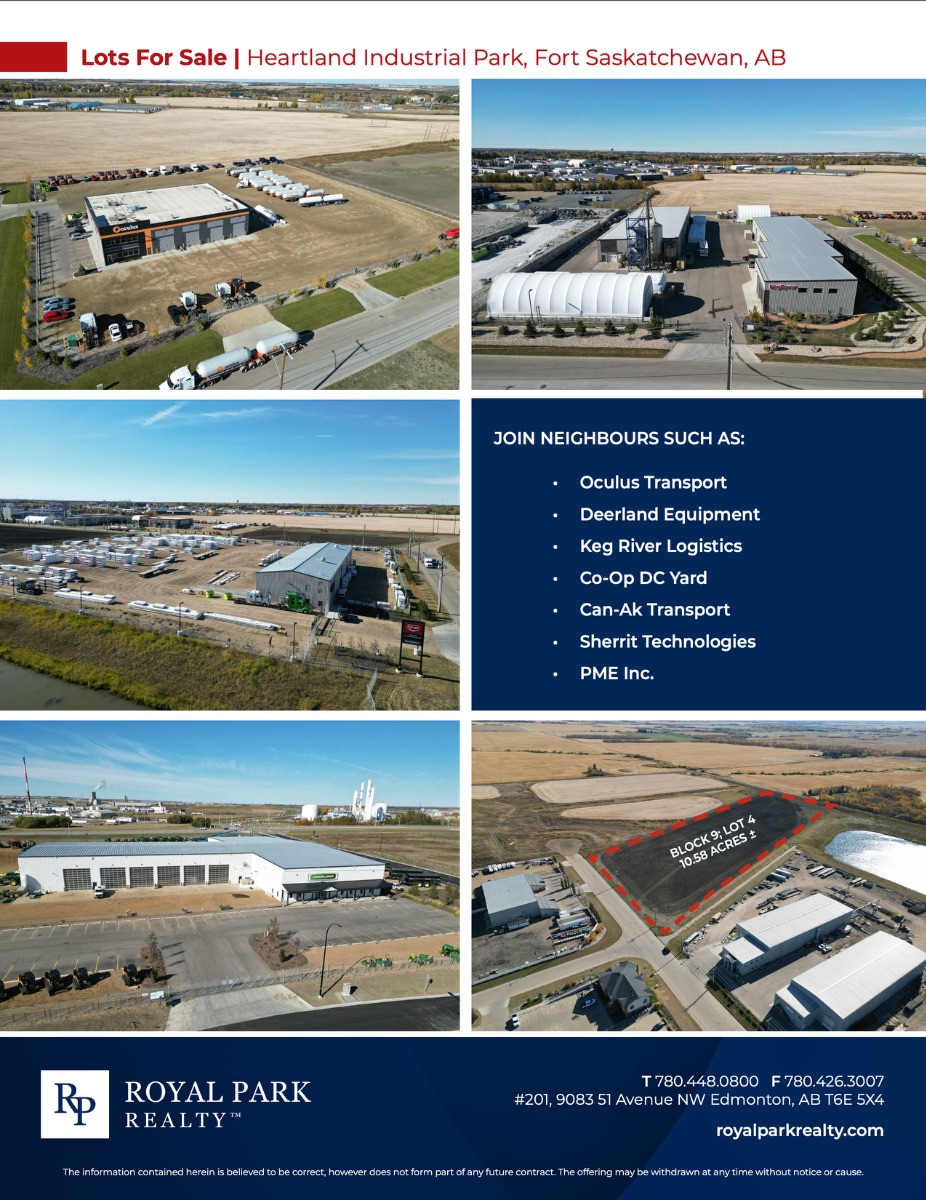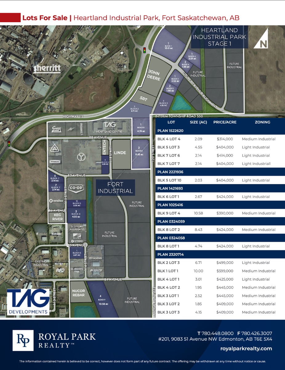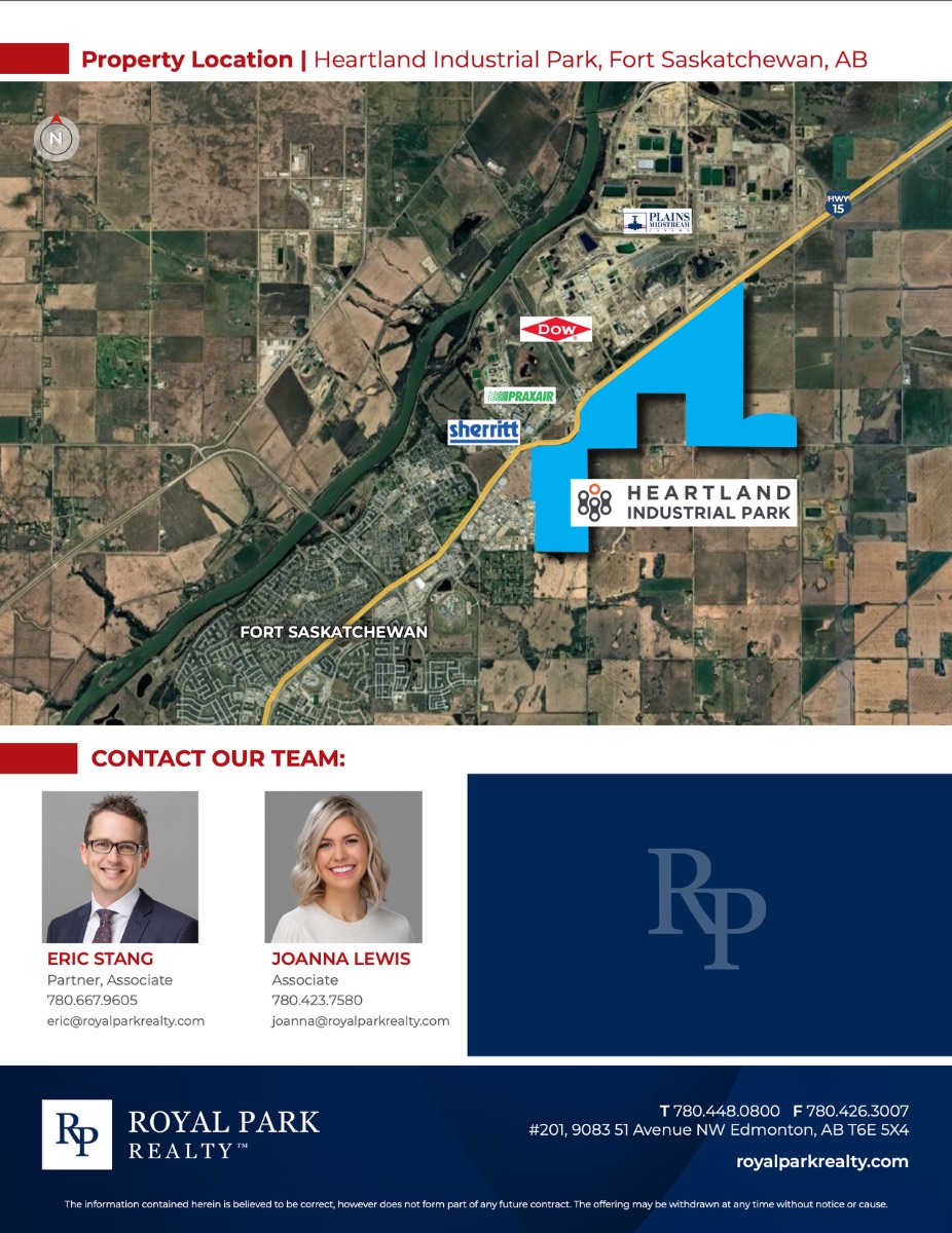 Industrial lots for sale Build to suit opportunities available Strategically located in Alberta’s Industrial Heartland High visibility along Highway 15 with traffic at an average of 52,000 vpd Tax incentives available